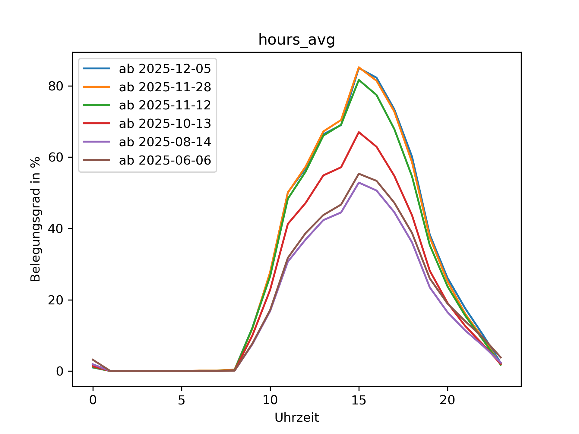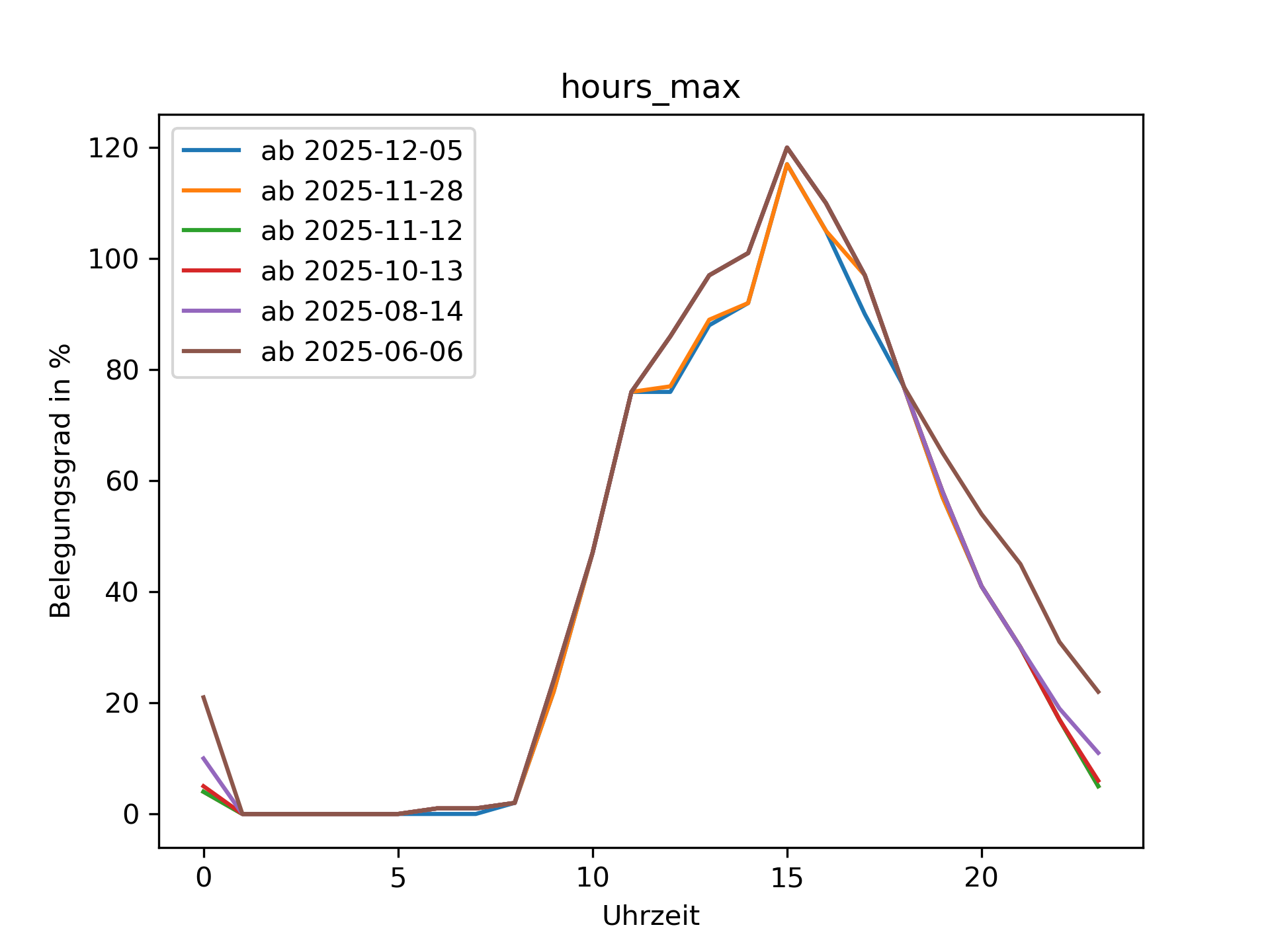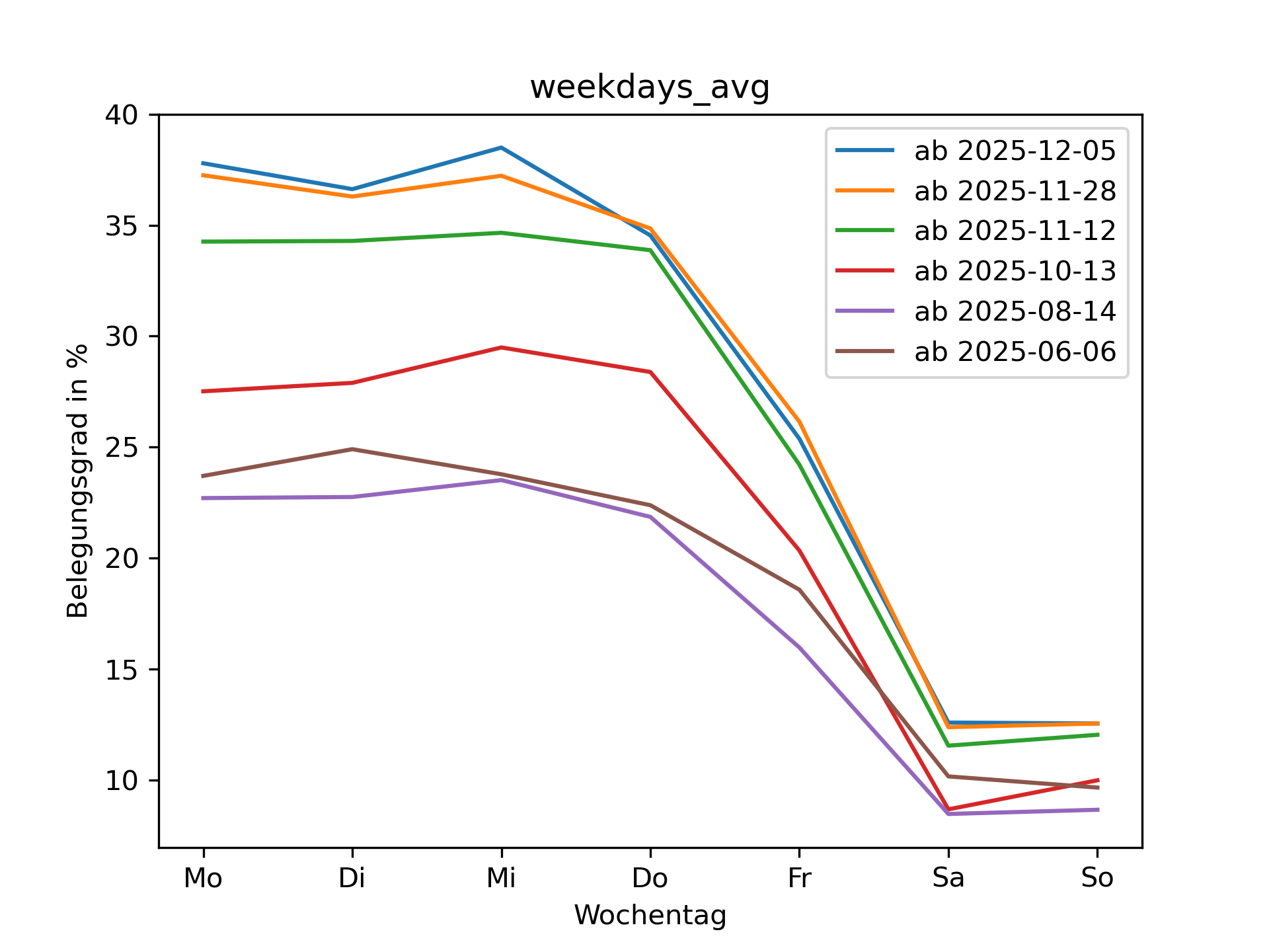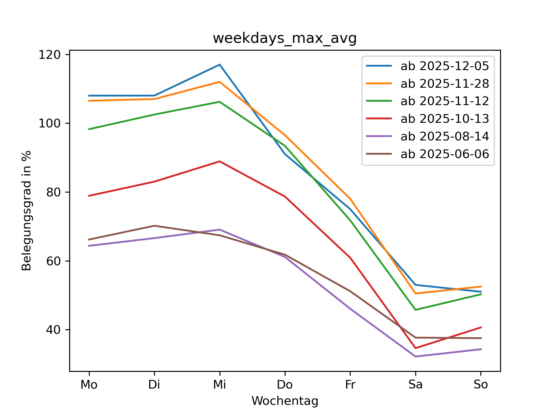 Hier schauen wir uns keine Maxima mehr an, sondern bilden den Durchschnitt der Belegungsgrade jeweils für z.B. jeden Montag und dann wird davon der Durchschnitt für diesen Wochentag gebildet.