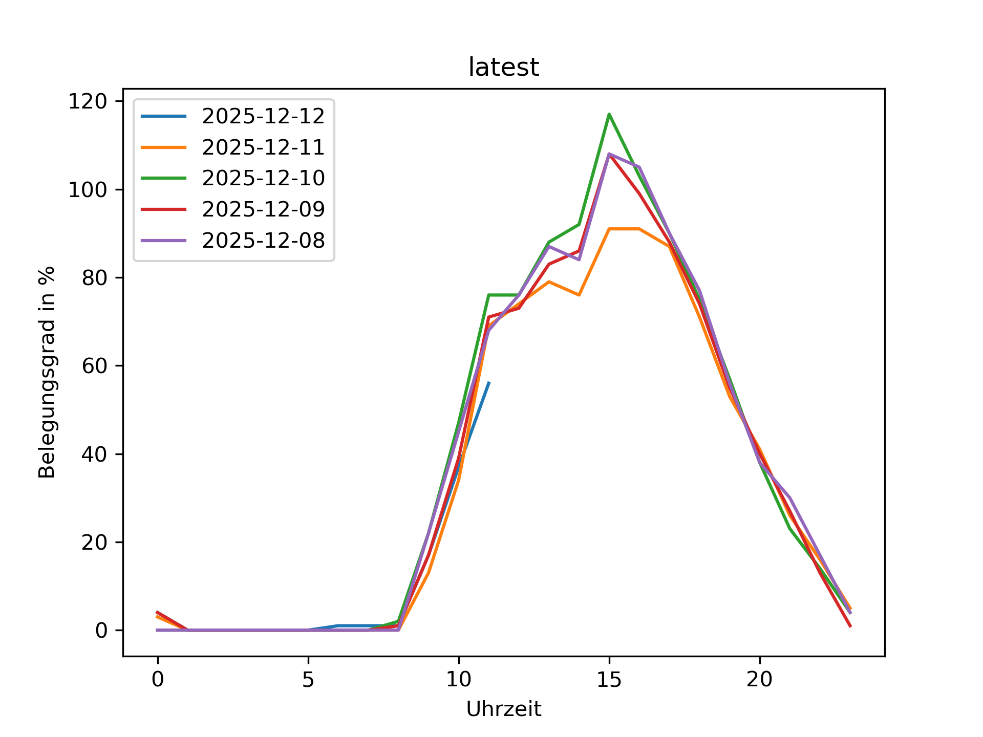 Die folgende Grafik zeigt die stündlichen Belegungsgrade der letzten 5 Tage, inklusive des heutigen Tages. Durch die Inklusion des aktuellen Tages ist dessen Graph meistens abgeschnitten. An dieser Grafik kann man zum Beispiel schön sehen, wenn die Besuche in der UB zum Wochenende hin abnehmen.