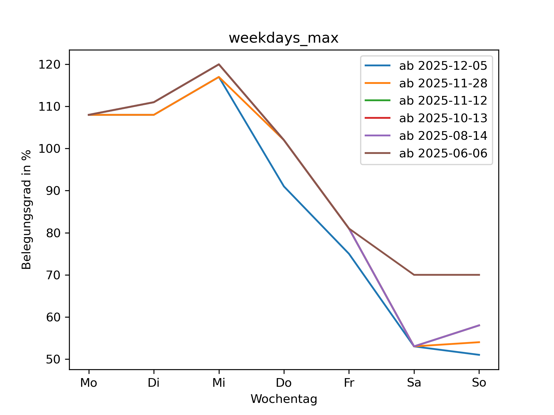 Hier schauen wir uns die maximalen Belegungsgrade z.B. von Montagen an und nehmen davon das Maximum. Und so für alle Wochentage.